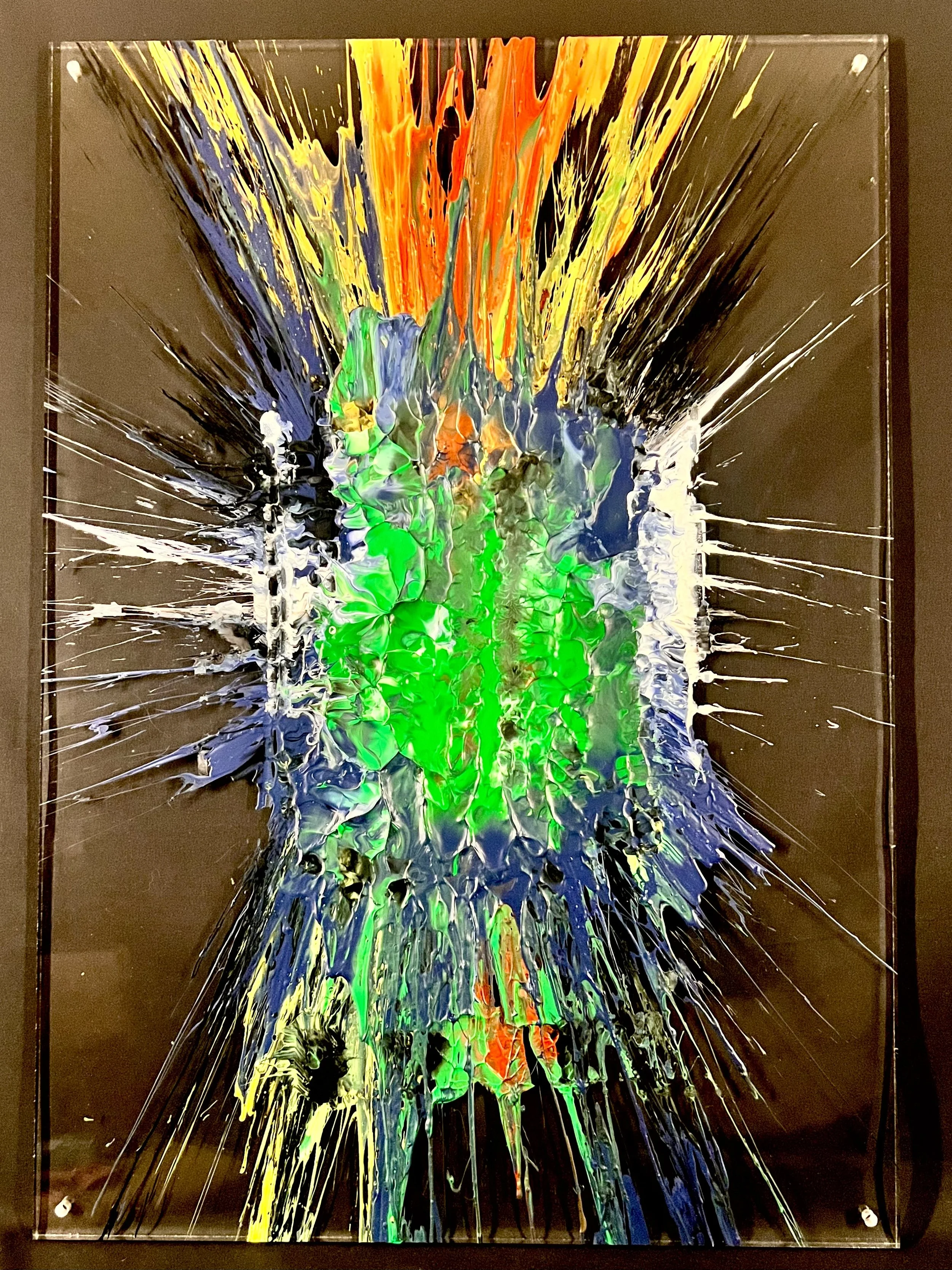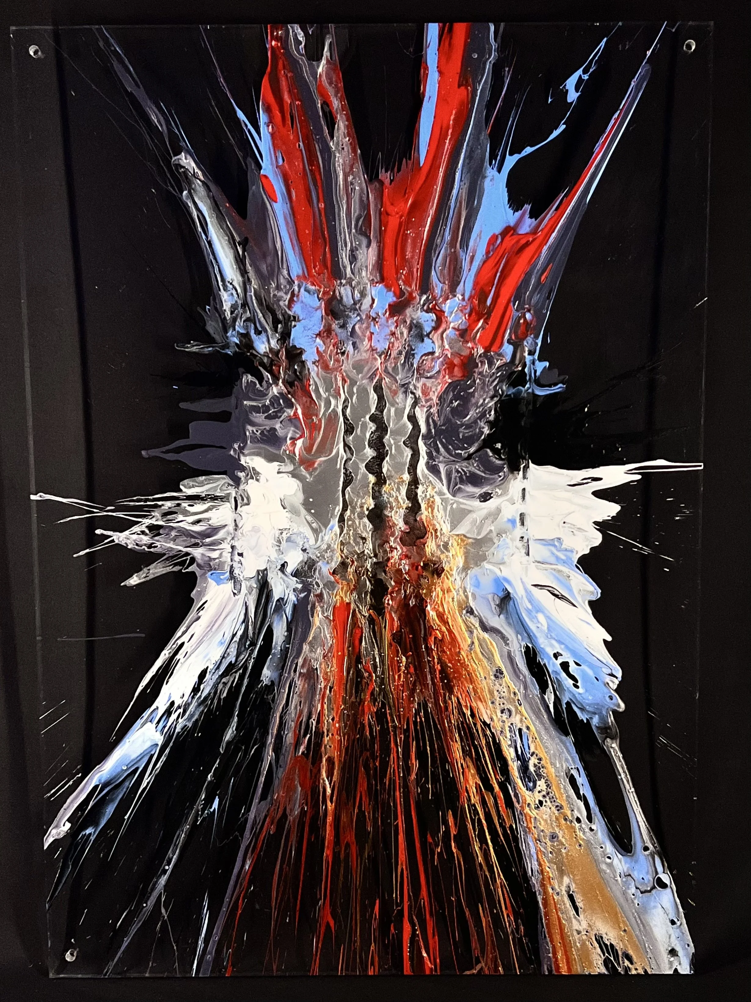 Radiallism is Elliot’s debut series, first exhibited at Boxengasse, the Porsche gathering in Oxfordshire. The idea grew from a childhood memory of a tyre advert—shot from below—showing water spraying outward in perfect arcs. This sparked the question: what if that energy and movement could be captured in paint?